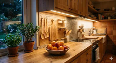 Ten a la vista utensilios de madera como cucharas, tablas de cortar o especieros, bien organizados. La madera equilibra la intensidad del fuego y aporta estabilidad, fomentando la creatividad culinaria y un ambiente cálido.