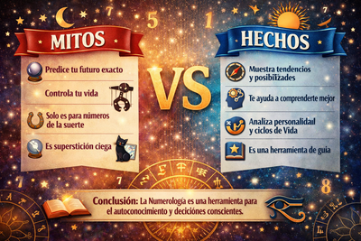 Mito 2: La numerología controla tu vida Hecho: La numerología no controla tu vida ni impone acontecimientos. Tus acciones, tu mentalidad y tus decisiones siempre tienen mayor poder. La numerología simplemente te ayuda a comprender tu naturaleza interior, tus fortalezas, tus debilidades y los tiempos adecuados. Usada correctamente, te empodera para tomar mejores decisiones, no para depender de los números.