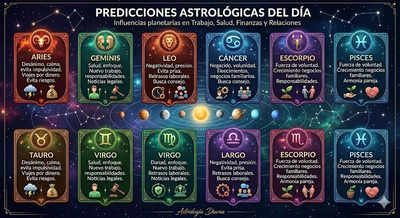 Consulta las predicciones astrológicas del día para los 12 signos del zodiaco. Los movimientos planetarios influyen en áreas como trabajo, salud, finanzas y relaciones.