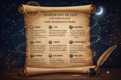 Lee el horóscopo de hoy, 15 de enero de 2026. Hoy analizamos con más detalle lo que las estrellas tienen preparado para cada uno de los 12 signos del zodiaco. Nuestro astrólogo ha estudiado el movimiento de los planetas y la alineación de los astros para traerte las predicciones más precisas y actualizadas. Ya sea que busques orientación en el amor, la carrera o simplemente saber qué te espera, aquí encontrarás las respuestas. Descubre lo que el cosmos tiene reservado para ti hoy.