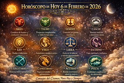 Lee el horóscopo de hoy, 6 de febrero de 2026. Hoy analizamos en detalle lo que los astros tienen preparado para cada uno de los 12 signos del zodiaco. Nuestro astrólogo ha estudiado el movimiento de los planetas y la alineación de las estrellas para ofrecerte predicciones precisas y actualizadas. Ya sea que busques orientación en el amor, la carrera o simplemente saber qué esperar, aquí lo encontrarás. Descubramos qué te depara el cosmos hoy.