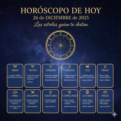 Lee el horóscopo de hoy, 26 de diciembre de 2025. Hoy analizamos más de cerca lo que las estrellas tienen preparado para cada uno de los 12 signos del zodíaco. Nuestro astrólogo ha estudiado los movimientos de los planetas y la alineación de las estrellas para ofrecerte las predicciones más precisas y actualizadas para el día que tienes por delante. Tanto si buscas orientación en el amor, el trabajo o simplemente una idea de lo que puedes esperar, aquí encontrarás la guía que necesitas. Veamos qué te depara hoy el cosmos.