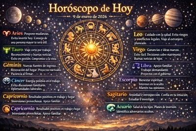 Lee el horóscopo de hoy, 9 de enero de 2026. Nuestro astrólogo ha analizado los movimientos planetarios y la alineación de las estrellas para ofrecerte las predicciones más precisas del día. Ya sea que busques orientación en el amor, la carrera o simplemente saber qué esperar, aquí lo encontrarás. Veamos qué te depara el cosmos hoy.