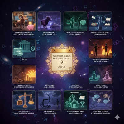 Lee tu horóscopo de hoy, 9 de noviembre de 2025. Hoy analizaremos más de cerca lo que los astros tienen preparado para cada uno de los 12 signos del zodiaco. Nuestro astrólogo ha estudiado los movimientos planetarios y la alineación de las estrellas para ofrecerte las predicciones más precisas y actualizadas del día. Ya sea que busques orientación en el amor, el trabajo o simplemente una idea de lo que te espera, aquí encontrarás todo lo que necesitas. Veamos qué te depara el cosmos hoy.