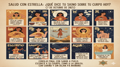 En nuestra tierra, donde la abuela ya sabía si iba a llover por el dolor de rodilla y donde la Luna influye hasta en el humor del barrio, la astrología no es solo cosa de estrellas: es sabiduría viva. Hoy, 7 de octubre de 2025, te traemos las predicciones de salud para cada signo con ese toque de calle, corazón y remedios que nunca fallan.