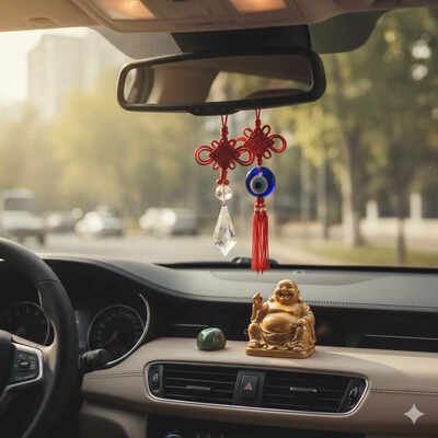 3. Nudo chino rojo o amuleto del ojo turco Un nudo chino de seda roja o un amuleto del ojo turco azul colgado del espejo es considerado un poderoso símbolo de protección. Se cree que bloquea la energía negativa (sha chi) y atrae paz y armonía dentro del vehículo.