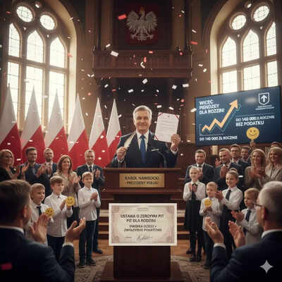 La reforma forma parte de un plan más amplio para reducir la carga fiscal sobre las familias, aumentar la renta disponible, incentivar la actividad laboral y estimular el consumo. Nawrocki hizo del impuesto cero sobre la renta (PIT) una de sus principales promesas de campaña. Anunció la medida en marzo como parte de su “Contrato con los polacos”, comprometiéndose a aplicarla desde el primer día de su presidencia. Tras ganar la segunda vuelta en junio, firmó la ley el 8 de agosto y la envió al Sejm, el Parlamento polaco.