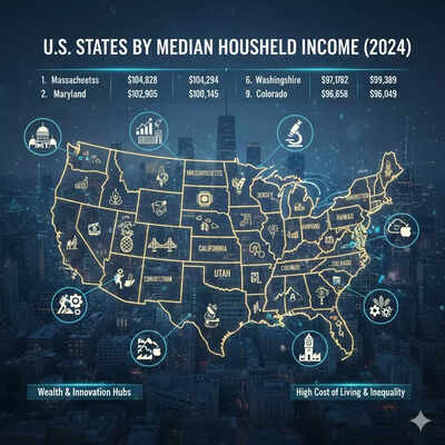 WorldAtlas, en 2024 los diez estados con mayores ingresos medios familiares registraron cifras que oscilan entre