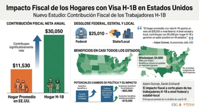 Un nuevo estudio revela que los hogares de titulares de visas H-1B contribuyen significativamente más a las finanzas públicas que los hogares estadounidenses promedio. En promedio, un hogar con visa H-1B aporta una contribución fiscal neta anual de 30.050 dólares, frente a los 11.530 dólares de un hogar típico en Estados Unidos.