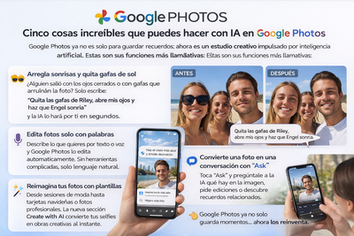Google Photos se convierte en tu estudio creativo con IA. Ahora puedes arreglar sonrisas, quitar gafas de sol y crear retratos artísticos solo pidiéndolo. Además, ofrece plantillas de IA para transformar imágenes al instante. Con el nuevo botón “Ask”, puedes hablar con tus fotos, obtener información y editarlas en segundos.